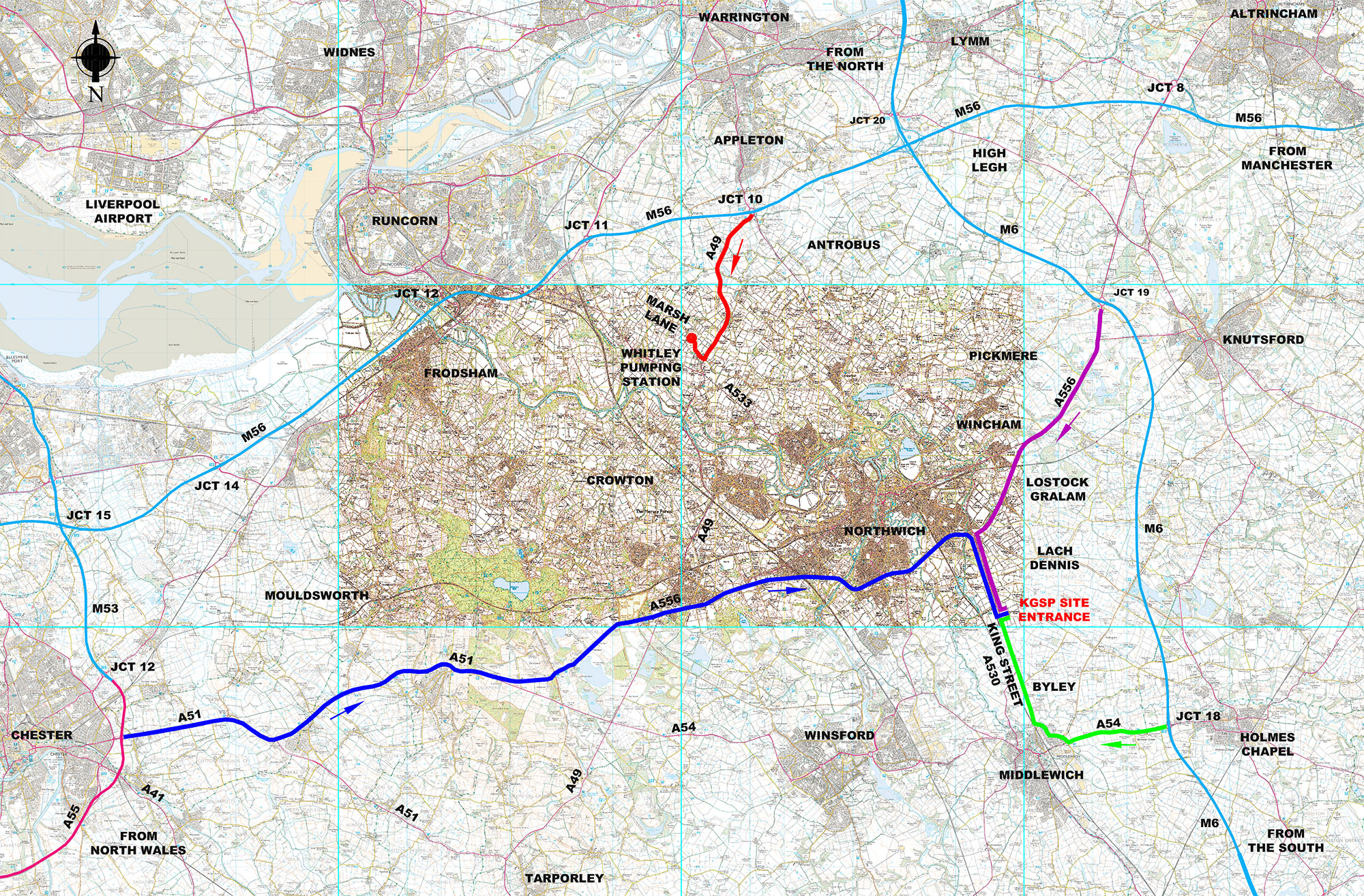 KGSL carefully considered traffic and transport associated with the consented development. Experience of construction of other gas storage projects in the area and feedback from the consultation was taken into account when developing the proposal, in particular the road layout and traffic routing. Drawing on this feedback, it is proposed to use the existing access point on King Street to access the development area, meaning HGVs will not travel through Byley village. An internal, one-way construction routing system is proposed for the main development site. Although the impact is considered negligible based on the existing traffic levels, a Construction Traffic Management Plan will be produced to support the construction phases to ensure that vehicles adhere to the proposed routes. The HGV routing drawing which shows offsite routes to the main entrance is appended to the Section 106 Agreement (a legal obligation) and shown in the Plan below. There are no plans to change the current Agreement as part of the Material Change.